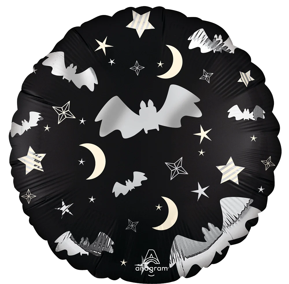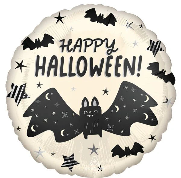 Bring a touch of spooky style to your celebration with the Halloween Bat Attack 18" Foil Balloon by Anagram! This double-sided balloon features “Happy Halloween” on the front with a bold bat design, while the reverse side showcases a sleek black satin finish with a playful bat pattern.